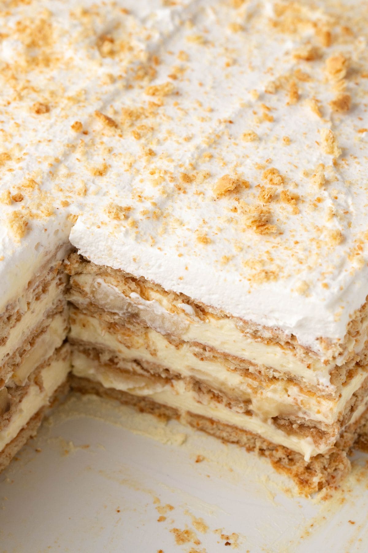 - Think thin. Keep each layer of crackers, pudding, and banana thin and even. Doing so will result in a more balanced texture and flavor throughout. When adding the final layer of whipped topping, cover the crackers completely. This will keep them from drying out.
