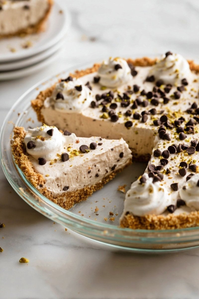 4. Garnish and serve. If desired, top pie with mini chocolate chips, chopped pistachios, powdered sugar, and/or whipped cream. Slice, serve, and enjoy!