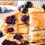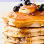 To keep the blueberries from sinking in the batter, I toss them in a little flour before adding them to the pancake mix. This helps create a light coating that prevents the berries from sinking. Or, just add them to the pancake batter after you pour it into the pan.