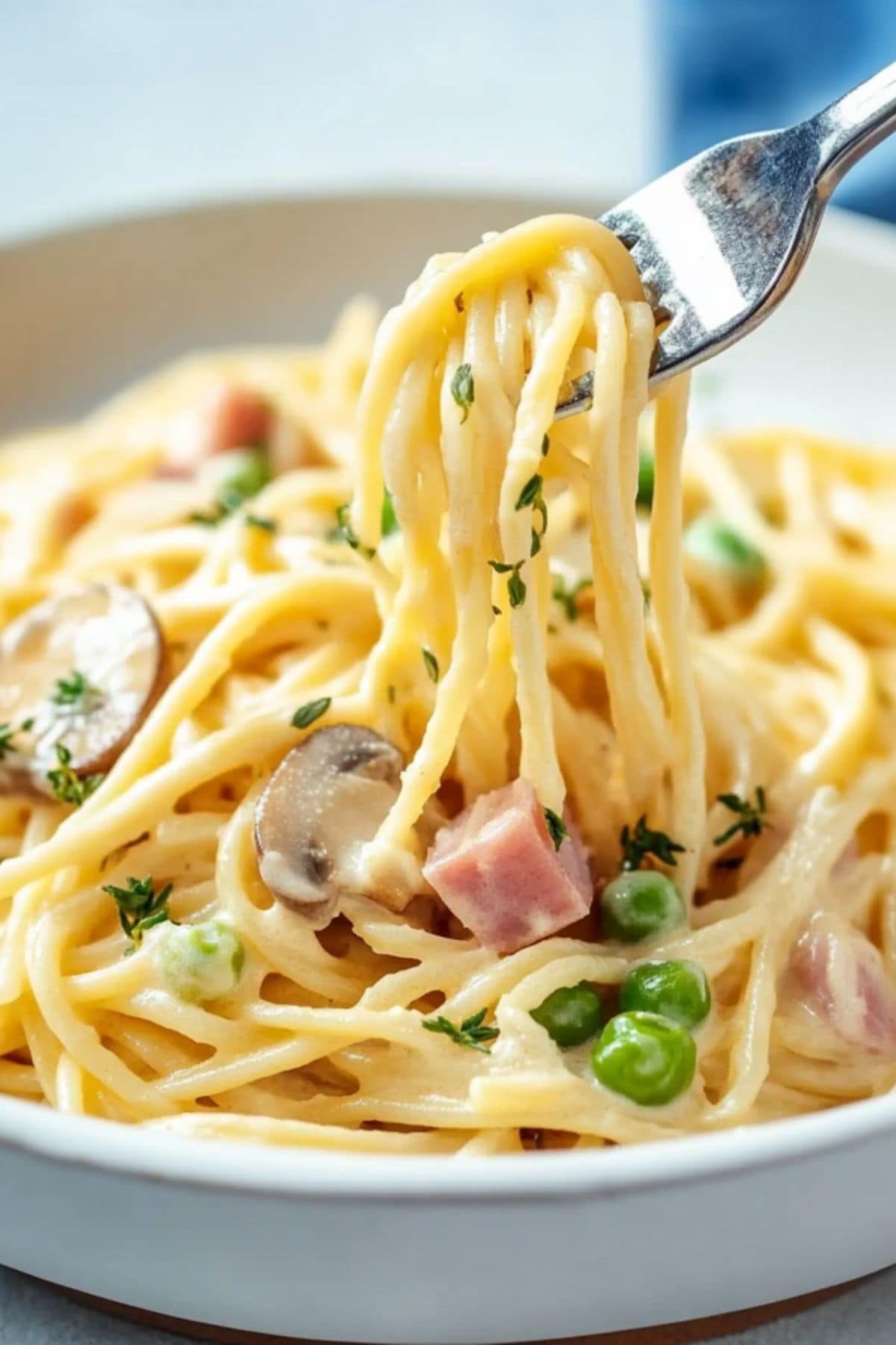 I love how creamy and cheesy this dish is, with tender spaghetti, savory ham, earthy mushrooms, and vibrant peas, all coated in a rich, velvety sauce.
